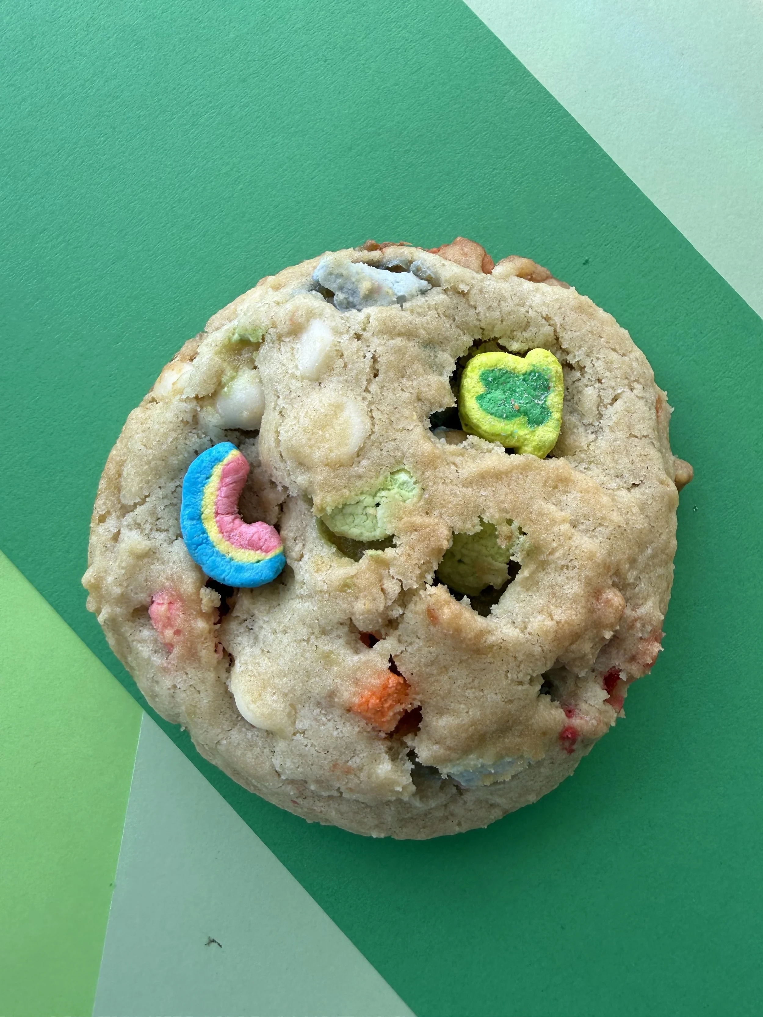 A sugar cookie elevated with Lucky Charms cereal pieces and the iconic Lucky Charms marshmallows.